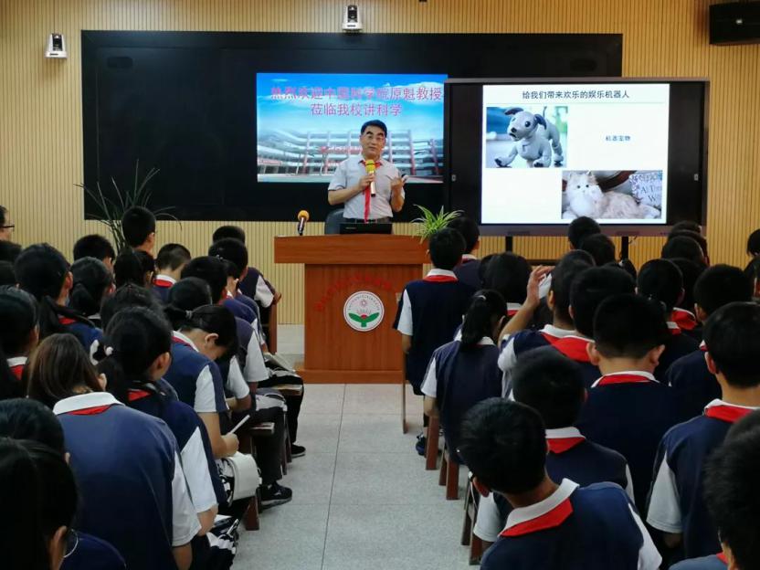 原魁教授从 “什么是机器人?”“为什么要做机器人?”“机器人能够做什么?”等多个方面给学生介绍了工作生活中各种各样的机器人。他通过大量生动有趣的图片、视频材料,用幽默风趣、通俗易懂的语言告诉同学们:机器人不一定像人,像人的不一定是机器人。科研精神,薪火相传。原魁教授耐心风趣的语言,和蔼亲切的笑容把学科学、爱科学的种子撒播到了孩子们好奇的充满探索力的心里,开阔了学生的视野,增长了知识,激发了学生的学习热情。