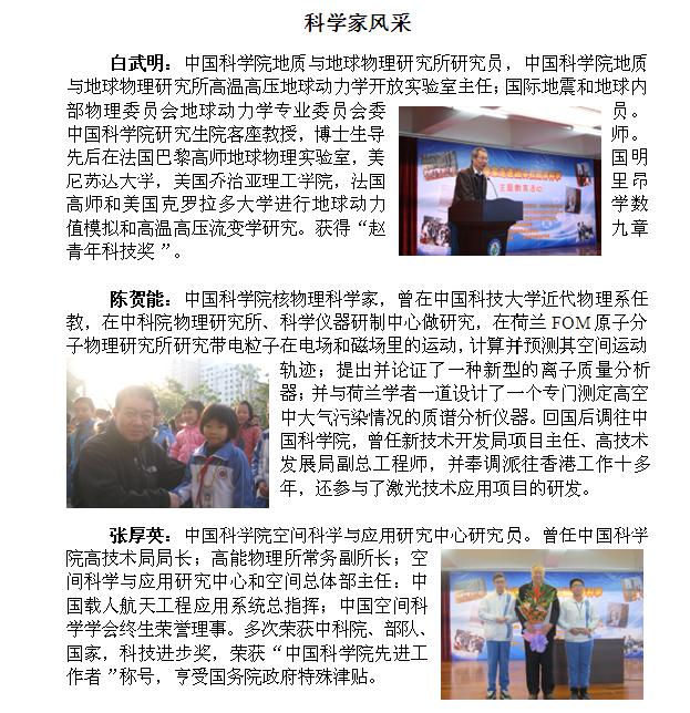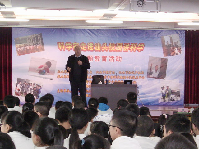 “科学家走进汕头校园讲科学”主题教育活动自2013年12月24日在汕头市东厦中学拉开序幕,连续5天,分别在汕头一中、东厦中学、蓬鸥中学、东厦小学、南澳后宅中心小学等14个中小学进行。本期活动邀请了中国科学院的地球物理科学家白武明教授、载人航天工程应用系统科学家张厚英教授和核物理科学家陈贺能教授三人到汕头开展“科学家走进汕头校园讲科学” 科普报告。报告主题包括“地震、火山和活动的地球”、“嫦娥探月,神舟华彩——中国载人航天工程应用纪实”、“科技为我们带来美好生活”等,有近1万名学生、老师及家长代表近距离的聆听了科学家们精彩报告,科学家用深入浅出、风趣幽默加上现场小实验的授课方式,向学生们阐述了高端的科学知识,让学生们体验到科技的奥秘,感受到“科学无处不在”,同时也激发了同学们对科学的无限渴望和对科学知识强烈的求知欲。现场孩子们提出很多奇思“异”想,他们提出“恐龙不是灭绝了,是变种了”、“随着大陆漂移,什么时候我们的五大洲中会有哪一个州沉没了”、“我们的航天飞船回到地球,会给地球带来污染吗”等等疑问,每个学校的报告厅,都成为学生们快乐求学的欢乐海洋!