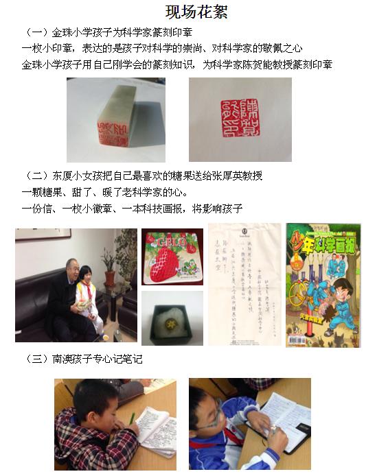 故事二:金珠小学的小女孩用自己在学校课外学习的篆刻印章的知识,事先为科学家陈贺能篆刻印章。在会后大胆的走上前送给陈教授!