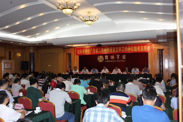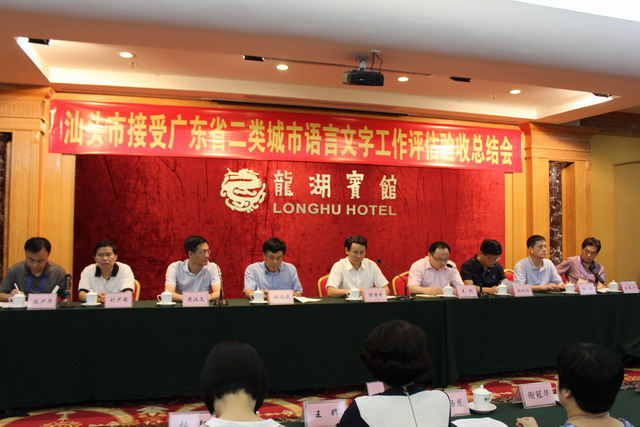 参加总结会的领导有省人大常委会委员谭泽中、省教育厅副厅长王创、汕头市副市长林依民、市政府副秘书长黄汉文和市教育局局长胡冬等同志。评估组所有专家、我市语委各成员单位负责同志等 100多人参加了总结会。会上,韩山师范学院院长林伦伦同志、广东电视台播音指导王泰兴同志和华南师范大学文学院院长陈少华同志分别代表各小组作了考察反馈报告。省人大常委会委员谭泽中同志做了评估总结报告,他充分肯定了我市的语言文字工作:建立强有力的领导机构;建章立制,依法管理;推普工作扎实开展,规范汉字书写教育抓实抓牢;能多造势,多引导,努力创造良好氛围。他代表评估组宣布我市顺利通过省二类城市语言文字工作评估验收。会上,汕头市副市长林依民同志作了表态性发言,表示将进一步统一思想,提高认识,不断加大语言文字法律法规的宣传力度,加大语言文字社会应用的监督检查力度,加大语言文字工作经费投入力度,全力推进我市语言文字工作再上新台阶,为建设幸福美丽汕头、助推汕头华侨经济文化试验区建设、全面建成小康社会做出应有的贡献。