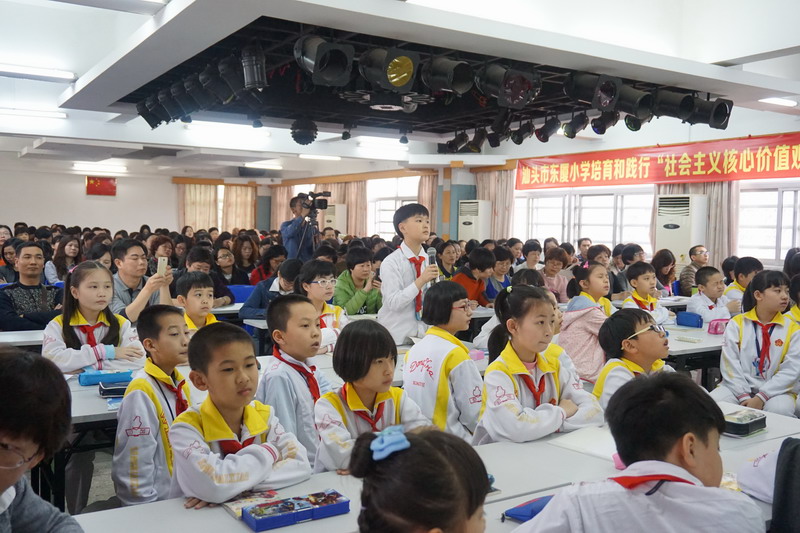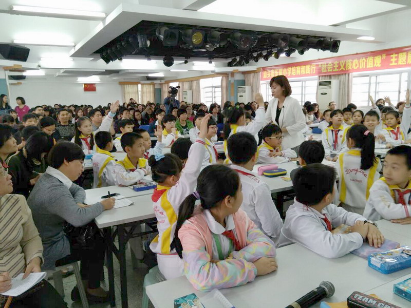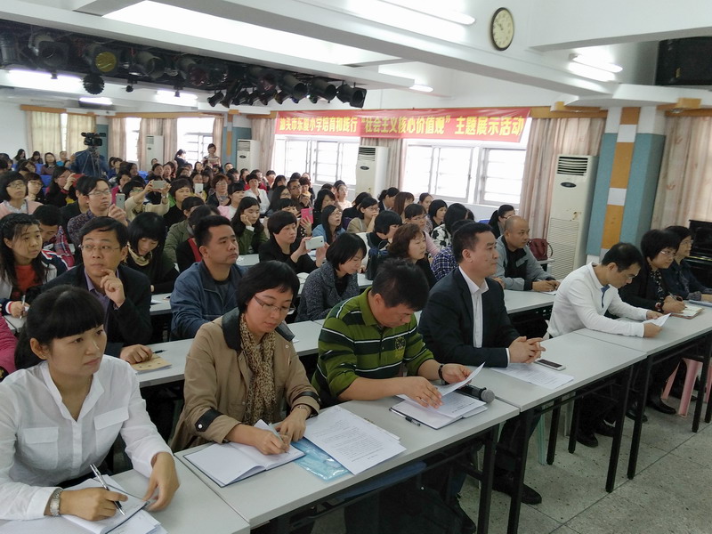 汕头市东厦小学老师姚源娟老师、王丽珊老师、陈佳嘉分别为参加活动的老师们展示了品德课、语文课、主题班会,袁丽琼副校长向大家介绍了学校在践行社会主义核心价值观进校园、进课程、进课堂的经验做法。市教研员纪伟婵老师和庄晓珊老师分别从品德课、语文课如何进一步渗透社会主义核心价值观,向与会代表提出了建议。纪伟婵老师要求品德课教师要把社会主义核心价值体系与课堂教学紧密结合起来,充分发挥品德学科主课堂、主阵地、主渠道的作用,采用生动的形式,使社会主义核心价值观走进教材,走进课堂,融入到学生学习成长的全过程;老师与学生一起营造良好的教学氛围,尊重学生,理解学生,鼓励学生,通过老师自身的行为影响、感染学生。庄晓珊老师要求语文老师要抓住语文学科工具性和人文性和谐统一的基本特点,从教学内容、教学目标、教学方法与学生学习方式上渗透“社会主义核心价值观”,老师也要在这方面率先垂范,身体力行。