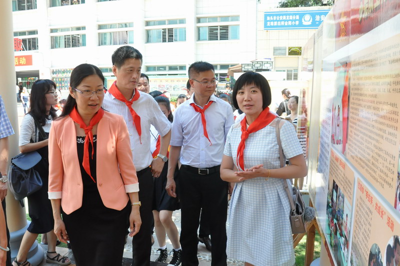 在龙湖区金阳小学,汕头市少先队肖建玲教师工作室11个成员学校示范引领,带领全市各区12个代表学校用展板的形式展示各校少先队教育工作成果。展示活动中,各校的少先队辅导员对学校少先队工作的开展状况向领导和来宾们进行了讲解,展示了各校少先队的风采和当代少先队员良好的精神风貌。逐个观看了各学校的展板后,领导们对少先队组织建设、特色活动、收获的成果表示赞许。