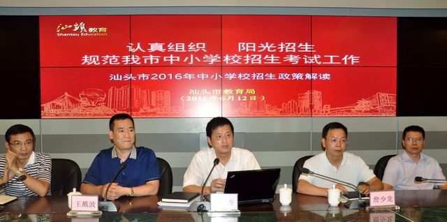 2016年6月12日下午,市教育局召开2016年汕头市中小学校招生政策通气会。会上,市教育局局长胡冬同志就义务教育阶段学校招生、高中阶段教育学校招生、2016年中考新政策、指标到校工作、学籍管理工作和坚持阳光招生等方面,对我市今年中小学校招生政策进行详细解读。