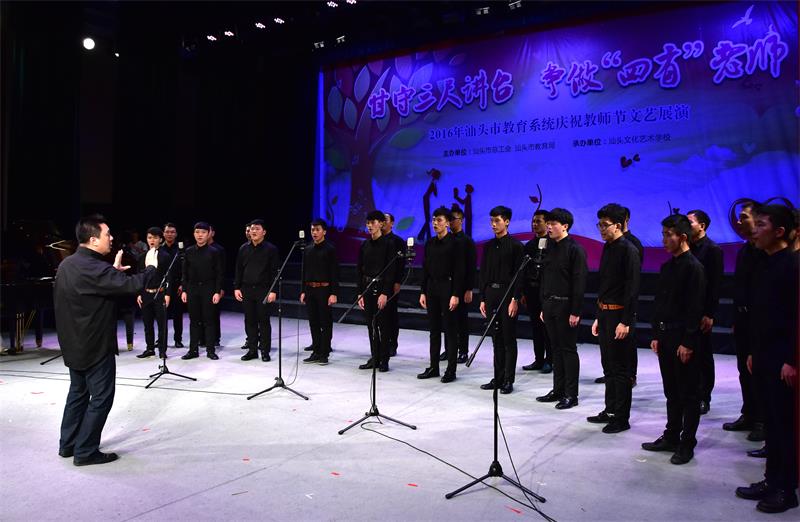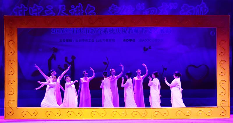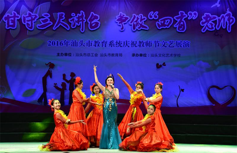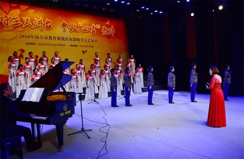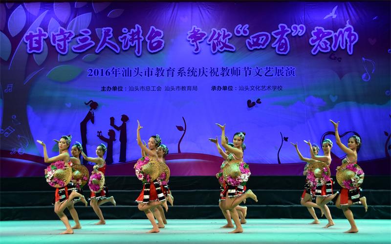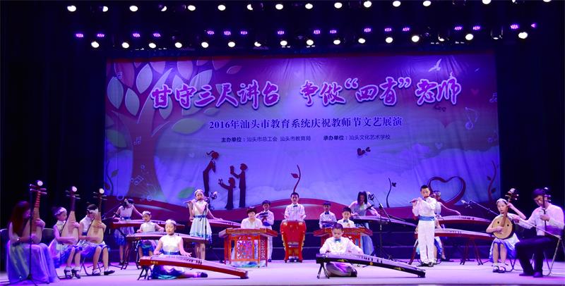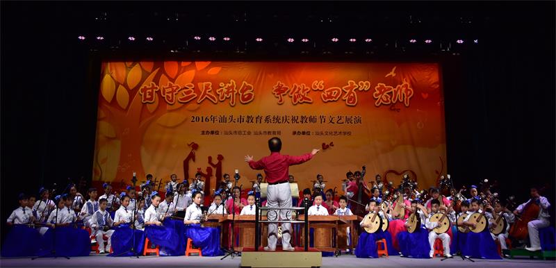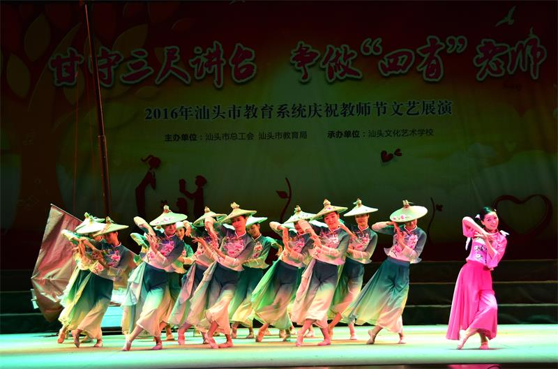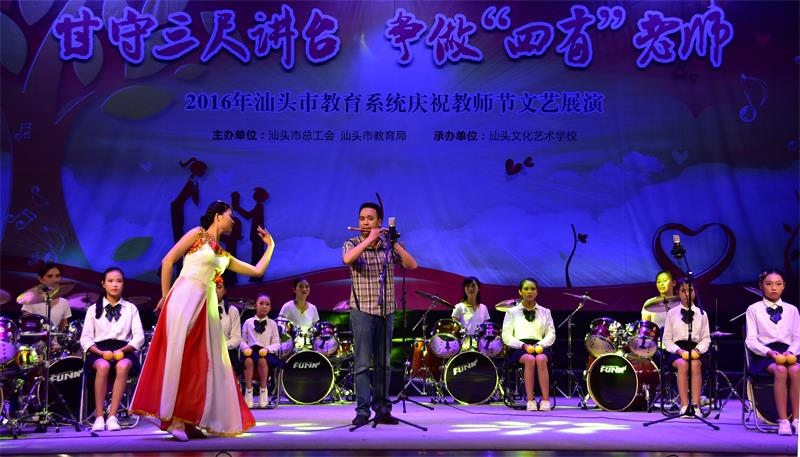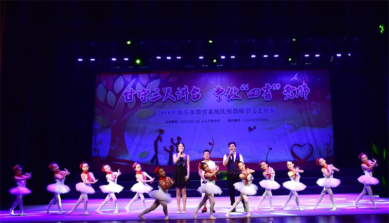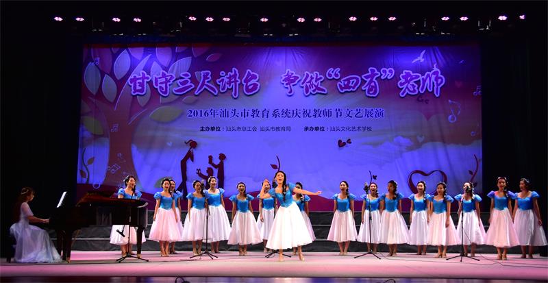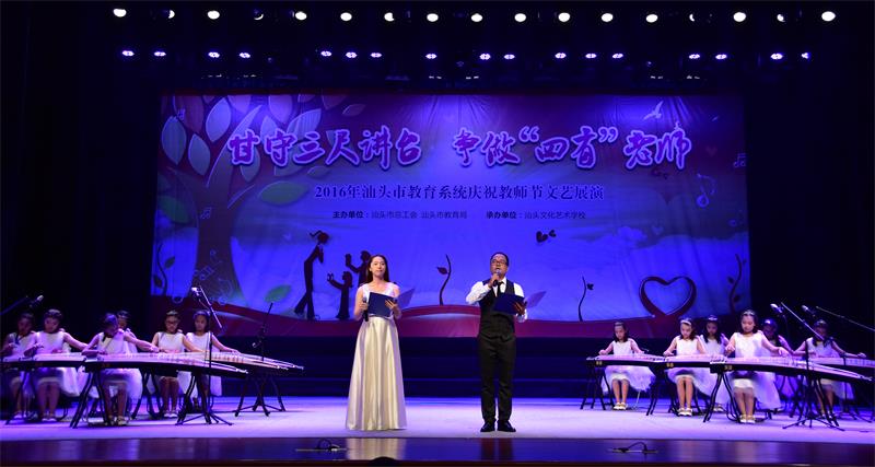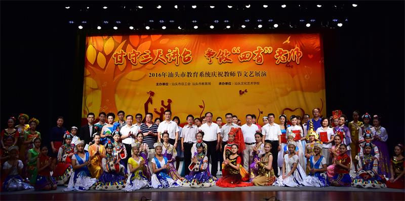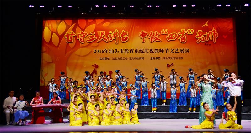 2016年汕头市教育系统庆祝教师节文艺展演成功举行,展现了我市广大师生团结活泼的精神面貌和多才多艺的时代风采。我市教育工作者将再接再厉,争做有理想信念、有道德情操、有扎实学识、有仁爱之心的“四有”好老师,齐心协力奏响教育发展新乐章。