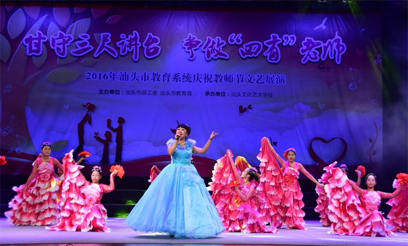 金秋九月,红烛颂歌。在教师节来临之际,由我市教育系统广大师生参演的“甘守三尺讲台,争做‘四有’老师——2016年汕头市教育系统庆祝教师节文艺展演”于9月9日下午在汕头文化艺术学校艺林剧场精彩呈现。展演活动奏响了一曲曲金秋的赞歌,献礼第三十二届教师节。