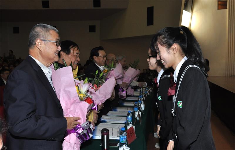 汕头一中学生向五位资深科学家献花