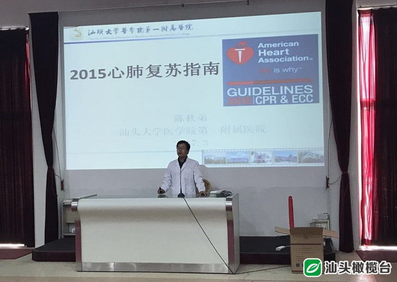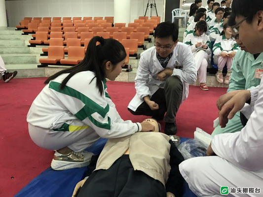 汕大第一附属医院医生陈小华认真仔细地向学生们讲解:“我们可以简单地把心肺复苏记为“CAB”,C就是胸外按压,A就是打开气道,B就是人工呼吸。对学生来说,如果能掌握胸外按压的技巧,那就是最重要的。胸外按压的时候,每分钟100到120次,深度是5到6公分。”