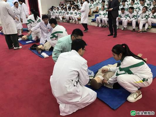 上午一大早,在市实验学校的礼堂内,来自汕大第一附属医院的十多名医务人员为学生们组织了一场生动的应急抢救培训课。针对汛期可能发生的溺水情况,医生们不仅用深入浅出的语言传授抢救知识,还提供训练假人让学生们亲自动手抢救伤者。宝贵的实操机会勾起孩子们浓厚的学习兴趣,而医务人员们也在一旁细心地进行教导。