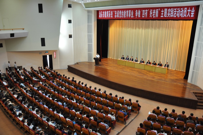 4月9日上午,市教育局在鮀岛影剧院召开汕头市教育系统“忠诚党的教育事业,争做‘四有’好老师”主题实践活动动员大会,市教育局班子全体成员和机关干部、区县教育局班子全体成员、汕职院分管领导、市教育局直属学校班子全体成员、市属职校负责同志以及各区县校长、幼儿园园长、教师代表共1218位同志参加会议。