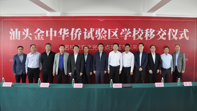 汕头市委副书记孙光辉,市委常委、市政府常务副市长李耿坚,市委副秘书长张锡潮,市政府副秘书长陈基平;华侨试验区党工委书记、管委会主任吴先宏,市教育局局长胡冬,副局长陈亦斌、詹少龙;汕头怡轩房地产公司法定代表人洪添丰,汕头金中华侨试验区学校校长陈升孝及全校教师参加了移交仪式。参加移交仪式的还有,学校工程的建设者、中交(汕头)公司、汕头金中华侨试验区学校的老师,以及市交通局、公安交警支队、汕头供电局、市自来水总公司、润新燃气公司等各有关单位的代表们。华侨试验区管委会副主任李钊主持移交仪式。