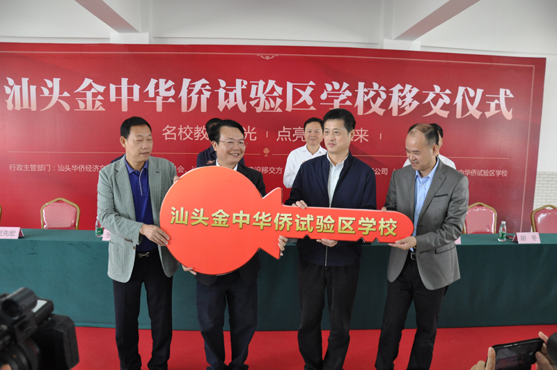 随后,市怡轩公司、汕头金中华侨试验区学校代表签署了移交书,华侨试验区管委会、市教育局代表签署了见证。签署移交书后,四方代表共同举起钥匙型板,标志学校为“交钥匙工程”,寓意着学校将在这里“开启智慧之门、点亮城市之光”。