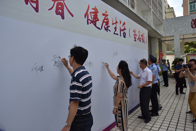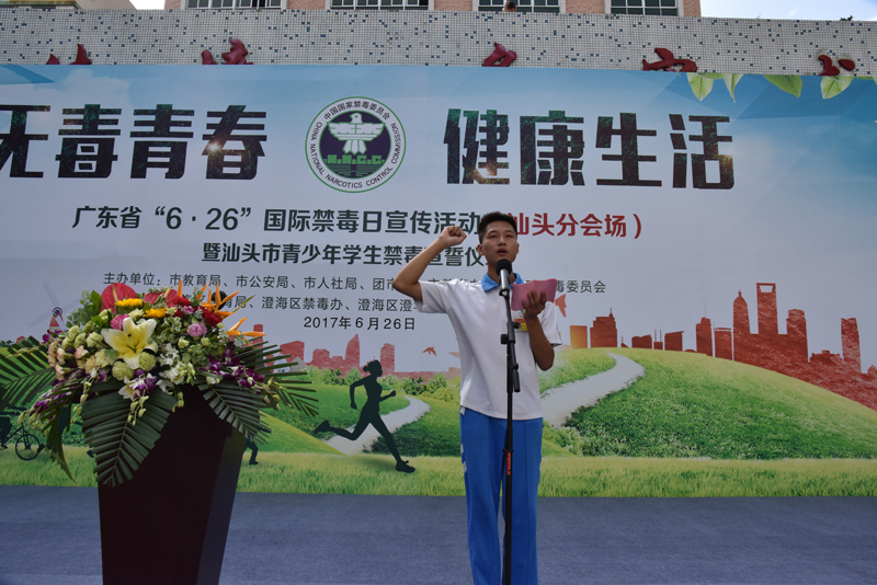 来自澄海区澄华中学的学生代表也做了发言;市禁毒办的负责同志组织大家进行禁毒宣示与禁毒签名并观看了禁毒宣传画展。