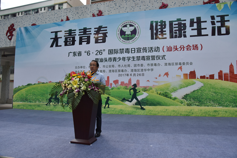 澄海区政法委刘金耀副书记为活动致辞,要求广大青少年学生要树立正确的人生观、价值观并养成良好的生活习惯,要以自己的实际行动,带动家庭和周围的人抵制毒品。