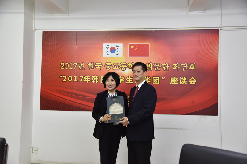 市教育局胡冬局长和李容德团长分别介绍汕头市和韩国教育的基本情况。访问结束后,双方交换纪念品并合影留念。