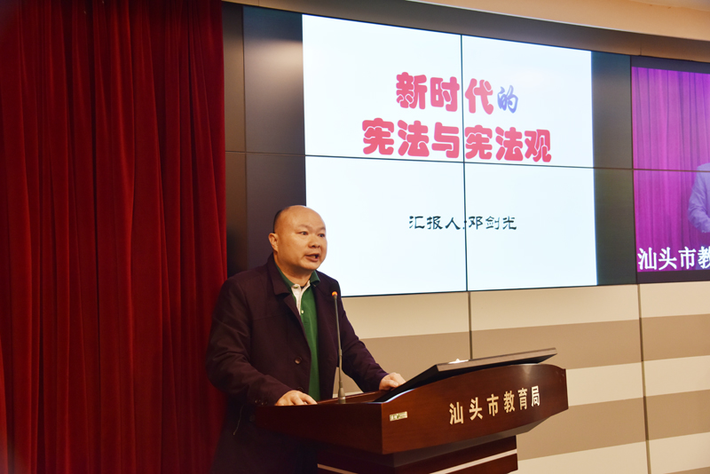 全国教育系统国家宪法日主题教育活动之前,市教育局专门邀请了汕头大学法学院邓剑光教授作题为《新时代的宪法与宪法观》的宪法精神专题报告。邓教授从宪法的基本认知、宪法回归的呼声与宪法的符号价值和宪法未来的展望等三方面深入浅出地为教育系统师生宣传解读了宪法及其精神,对在全市教育系统大力弘扬宪法精神和社会主义法治精神具有深刻的现实意义。