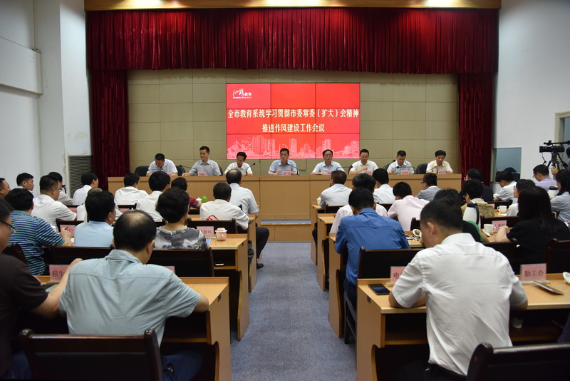 会议强调,全市教育系统要以习近平新时代中国特色社会主义思想和党的十九大精神为指导,深入贯彻习近平总书记重要讲话精神,切实推进作风建设年活动持续深入开展。主要做好三个方面重点工作:一是要打造过硬工作作风,树立教育行政干部队伍良好形象。进一步增强规矩意识,特别是要做到严守政治规矩,严守工作规矩。二是要敢担当、善作为,全面推进教育系统作风建设。积极推进学前教育普惠健康发展、义务教育优质均衡发展、高中阶段考试招生制度改革、中小学教师“县管校聘”管理制度改革、乡村小学全科教师培养制度等教育领域各项综合改革工作,敢挑重担,勇于担责,把考试做妥、把招生做稳、把改革做实、把教师带好,营造风清气正、创新实干的事业发展良好氛围,全面推进教育系统作风建设,努力让每个孩子都能享有公平而有质量的教育。三是要进一步深化主题实践活动,推进作风建设向纵深开展。继续在全市教育系统深入实施“忠诚党的教育事业,争做‘四有’好老师”主题实践活动。一方面,坚持正面教育引导,以加强师风师德建设为着力点,建立健全师德建设长效机制;另一方面,坚持问题导向,持续开展有偿家教治理工作,促进教育系统作风持续好转。