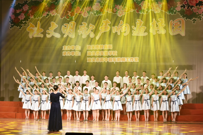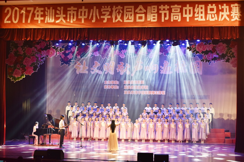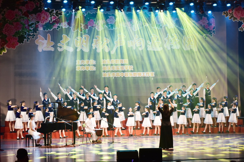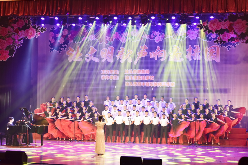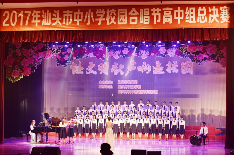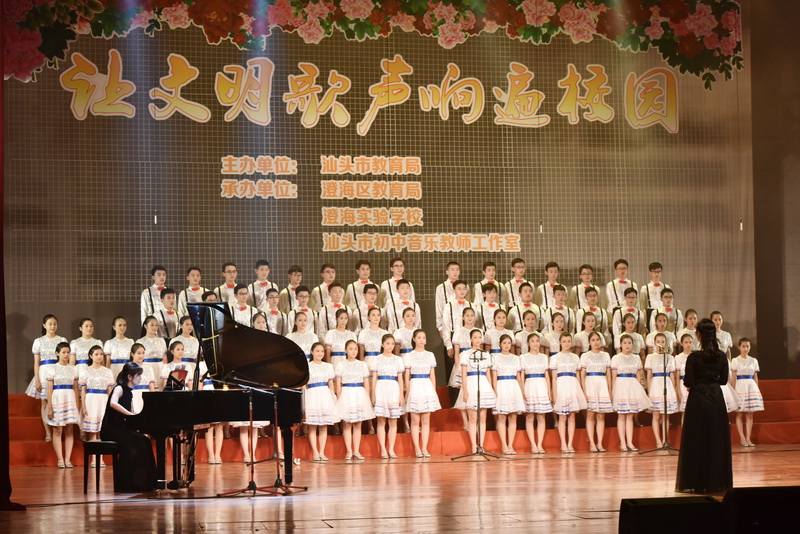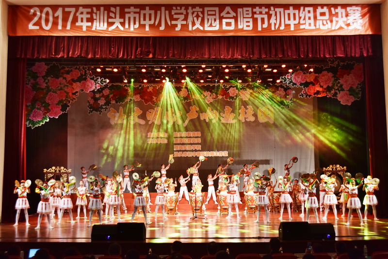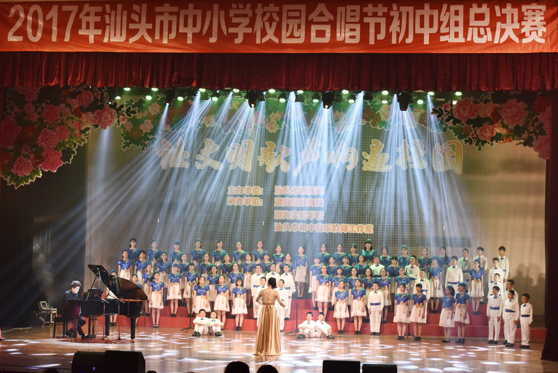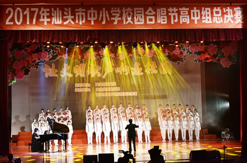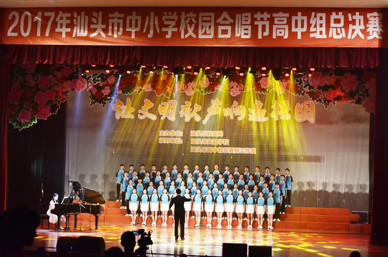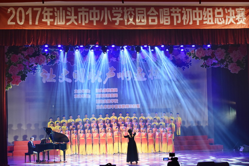 金秋时节,中国共产党第十九次全国代表大会胜利闭幕,我市广大师生欢欣鼓舞,豪情满怀,纷纷表示要以饱满的热情和昂扬的精神,为实现中华民族伟大复兴的中国梦不懈奋斗。就在这喜庆的日子里,由汕头市教育局主办,澄海区教育局、澄海实验学校、汕头市实验学校、汕头市中学音乐教师工作室承办的“让文明歌声响遍校园”——2017年汕头市中小学校园合唱节初中组、高中组总决赛于2017年11日1日、2日在鮀岛影剧院隆重举行。市教育局领导、各区县教育局领导、各有关学校领导出席活动,各中小学音乐骨干教师观摩了比赛。