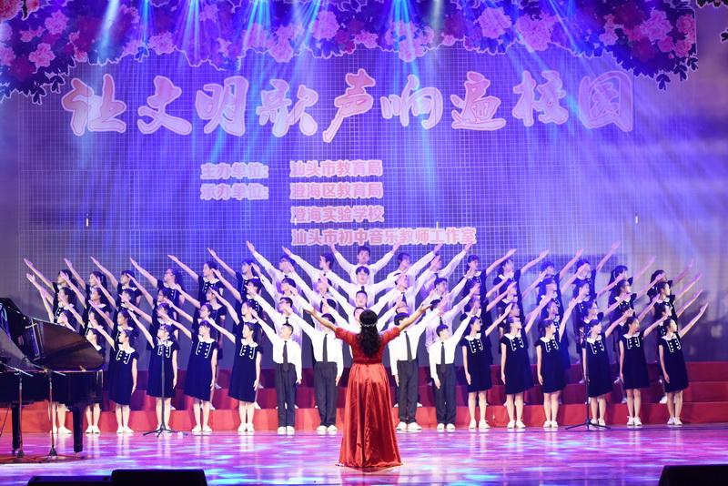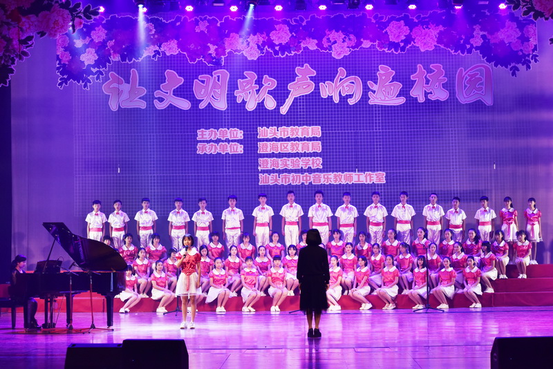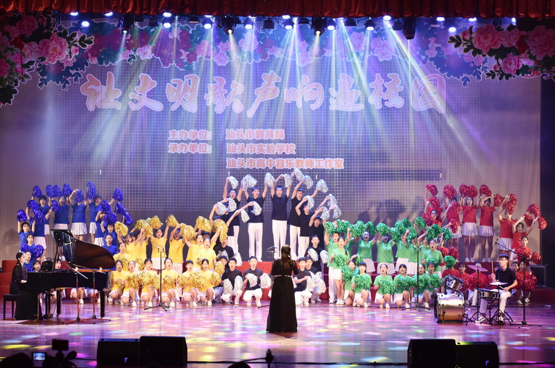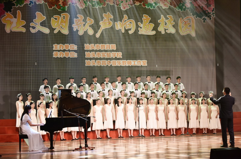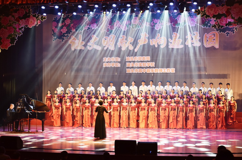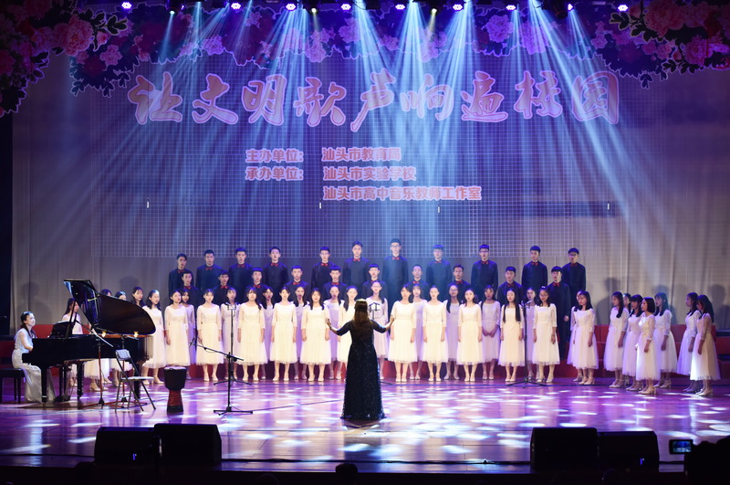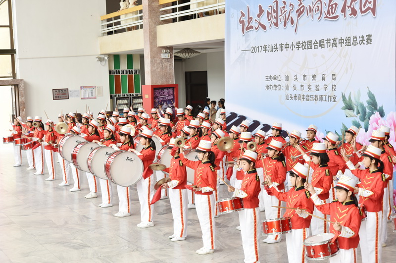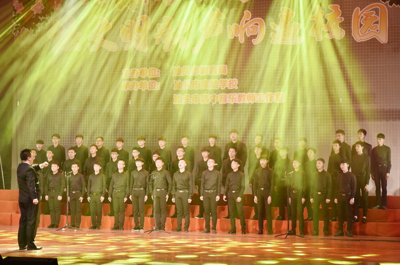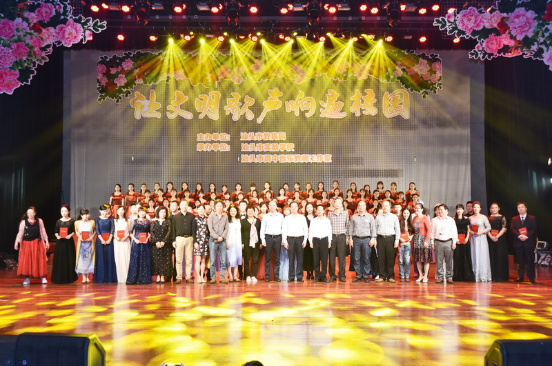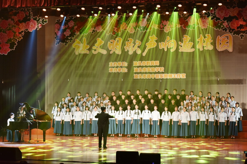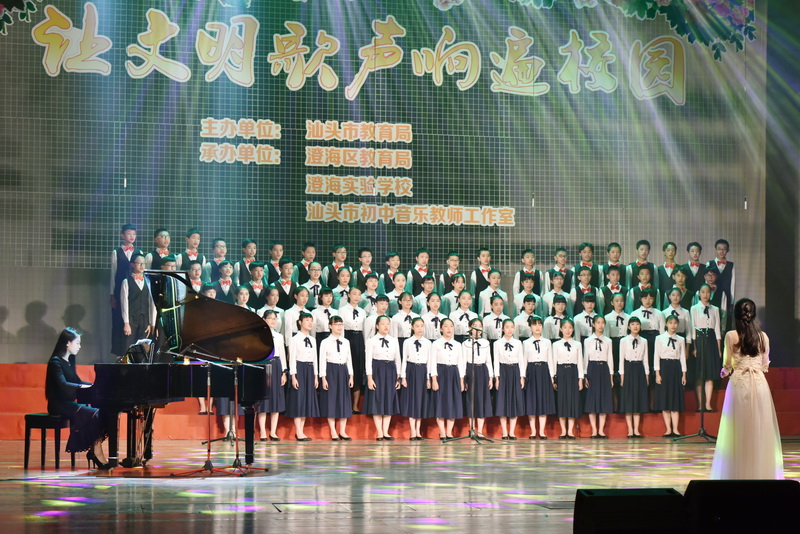 金秋时节,中国共产党第十九次全国代表大会胜利闭幕,我市广大师生欢欣鼓舞,豪情满怀,纷纷表示要以饱满的热情和昂扬的精神,为实现中华民族伟大复兴的中国梦不懈奋斗。就在这喜庆的日子里,由汕头市教育局主办,澄海区教育局、澄海实验学校、汕头市实验学校、汕头市中学音乐教师工作室承办的“让文明歌声响遍校园”——2017年汕头市中小学校园合唱节初中组、高中组总决赛于2017年11日1日、2日在鮀岛影剧院隆重举行。市教育局领导、各区县教育局领导、各有关学校领导出席活动,各中小学音乐骨干教师观摩了比赛。