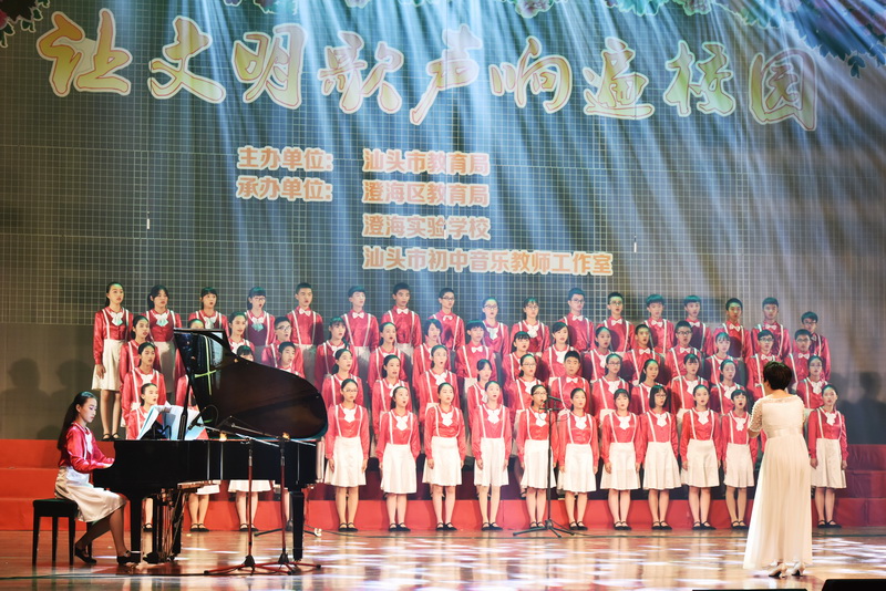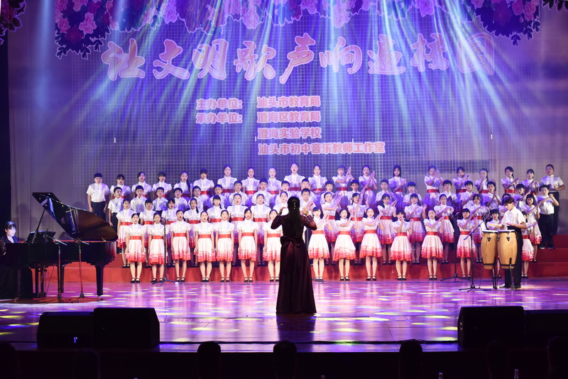 比赛活动在建阳小学热烈的潮州大锣鼓《鼓乐催开创文花》中拉开序幕。歌声如潮,同学们在《共青团员之歌》的歌声中讴歌党的十九大;在《龙的传人》中弘扬中华优秀传统文化精髓;在《龙船调》中演绎浓郁乡音乡情;在《故乡的亲人》中传递深情的人间真爱;在《Do Re Mi》、《Come to the music》中展示青少年开阔的国际视野与胸怀;在《乘着歌声的翅膀》中放飞梦想……同学们以团结活泼的精神风貌,精益求精的艺术风采抒发着对党、对祖国的无限热爱和对文明汕头的美好祝愿,雷鸣般的掌声在剧场不断响起。其后,更有澄海实验学校、澄海职业技术学校、汕头一中、市实验学校的精彩节目献演,澄海教工合唱团和莲阳中学的大型歌舞《把一切献给党》更是将活动推向了高潮,圆满诠释了“喜庆十九大 文明歌声遍校园”的活动主题。这是一场精彩的音乐盛宴,好声音接连不断,天籁之音尽呈。