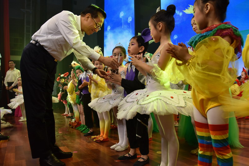 节目结束后,参加活动的领导一起上台为孩子们送上节日礼物,与孩子们合影留念。陈良贤代表市委、市政府给全市少年儿童们送上了节日的祝福,对广大教师表示衷心的感谢。他指出,少年儿童是祖国的未来,也是汕头的未来。汕头是我们共同的家园,要从小培养少年儿童热爱家园,共建共享我们美丽家园的信念。汕头加快全面振兴发展要依靠创新驱动发展战略,由老师学生自编自导自演的节目,既彰显了汕头上下同心同气,“小手拉大手”,共建美好家园的信心和决心,又凸显了我市创新驱动发展的基础和活力,希望广大教师再接再厉,创造出更多优秀的原创作品,注重培养少年儿童创新、文明、礼貌、向上的优良品格,进一步凝聚共建美好家园的强大力量,助推汕头全面振兴发展。