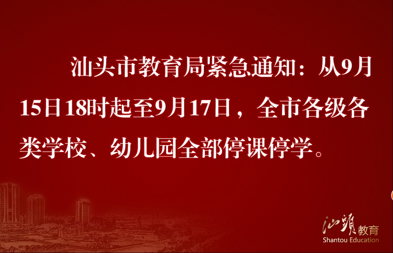 根据省教育厅紧急通知,从9月15日18时起至9月17日,全省各级各类学校、幼儿园全部停课停学。少年宫、校外培训机构全部停止一切培训和教育活动。寄宿制学校学生原地做好防台风工作。相关通知如下。