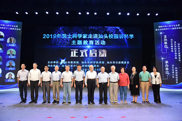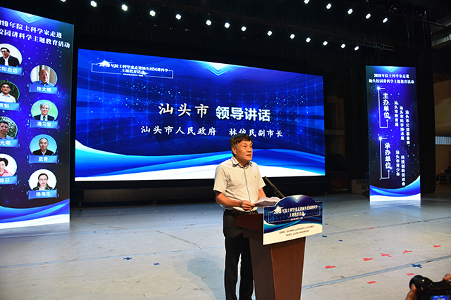 10月21日上午,由市教育局、市科技局、市公益基金会主办,汕头市青少年科技创新促进会协办的“2019年院士科学家走进汕头校园讲科学主题教育活动”启动仪式暨首场科普报告会在市艺都大剧院举行。主办单位的领导、校长、科技教师代表及金山中学、汕头市第一中学、广东汕头华侨中学等8所学校学生代表共1200多人聆听了报告。副市长林依民出席活动并讲话。