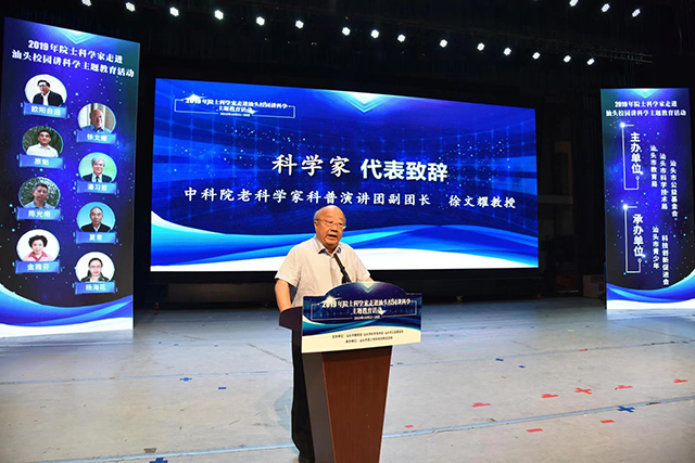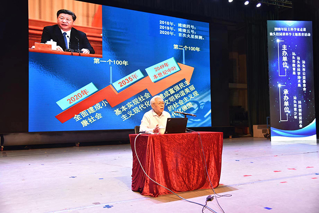 “2019年院士科学家走进汕头校园讲科学主题教育活动”为期一周,本次活动邀请到中国月球探测工程首席科学家、中科院院士欧阳自远;中国著名地球物理学家徐文耀;中国科学院力学研究所研究员陈光南;中国科学院自动化研究所研究员原魁;中国气象局国家卫星气象中心研究员夏青;中国科学院中国遥感卫星地面站研究员潘习哲;中国科学院数学与系统科学研究院研究员金雅芬;中国科学院微生物研究所研究员杨海花等8位来自中科院不同专业领域的院士及科学家莅临汕头。参加活动的8位科学家将走进我市六区一县各中小学校,为我市带来76场精彩报告,成为历届活动中参加的科学家人数最多,场次最多,受益师生最多的一次。