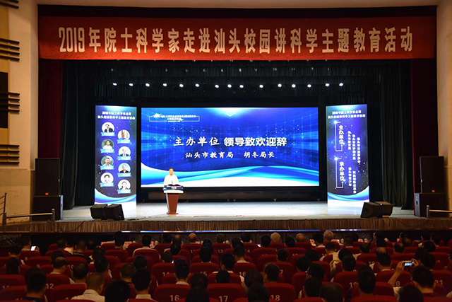 汕头市教育局胡冬局长在致辞中指出,我市高度重视青少年的科学教育,市教育局出台了《关于进一步加强中小学校科学教育提升学生科学素养的通知》,将“院士科学家走进汕头校园讲科学”作为我市未成年人思想道德建设特色品牌。在特色品牌的引领下,我市以课程建设为重点,加强专兼职科学教师配备和科技教师培养,着力提升科学教师专业水平。开展“少年科学家”培养计划,每年资助50名高中生走进大学和科研院所,接受科学家的专业指导。在初中、小学中开展“小小科学家”科学教育体验活动,每年吸引1万多名学生参与活动。开展数学、物理、化学、生物和信息学等学科核心素养竞赛,组织学生参加中小学生电脑作品竞赛、科技创新大赛。把社会责任感、创新能力、实践能力的培养融入各种教学内容和活动中,探索多种培养模式,增强中小学生的创新意识、学习能力和实践能力,促进我市中小学科学教育水平大幅提升。
