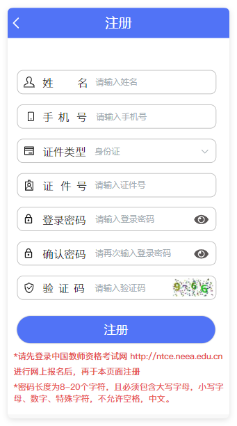 【注意:请先登录中国教师资格网http://ntce.neea.edu.cn进行网上报名后,再于本页面注册】