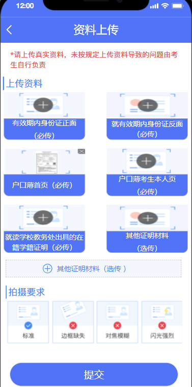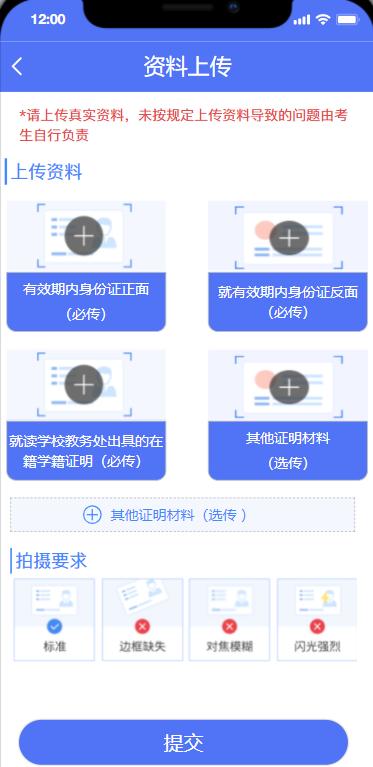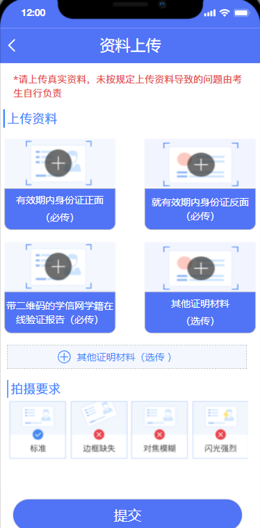 ③带二维码的学籍认证报告或学生证或就读学校出具的在籍学习证明。如上传学生证,则需上传考生照片页和注册登记页清晰照片,注册登记页要有本学期注册信息(需盖章,下同)。