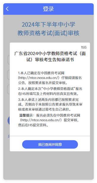 进入系统后,考生应仔细阅读“考生告知承诺书”,点击“我已阅读并同意”进入系统“登录”页。