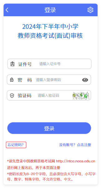 未注册账号的考生,点击登录页的“还没有账号?点击注册”链接,进入注册页面,按页面上的要求填写注册信息。登录时,须输入证件号、密码,以及验证码。