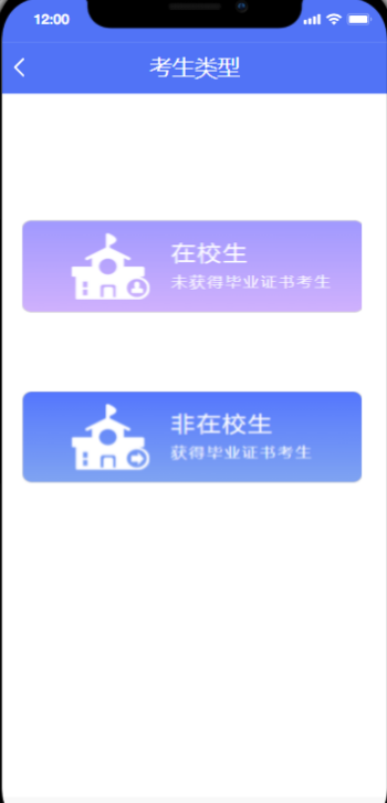 点击选择一种考生类型,“在校生”或“非在校生”,随后根据户籍类型,选择“户籍考生/居住证考生”进入学信网学籍/学历验证码校验。