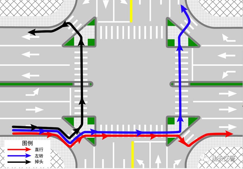 非机动车需要调头通过路口时,在行至路口后,靠右进入右侧步道,并行至垂直方向路口人行横道前等候,待绿信号灯亮时经人行横道通过路口。
