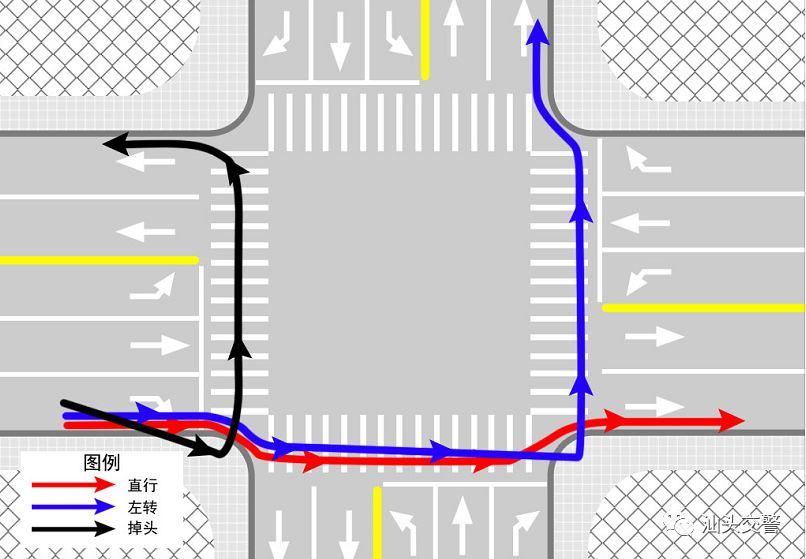 非机动车需要左转通过路口时,应按照逆时针方向二次过街。即首先按照顺向信号灯指示经人行横道行至前方步道等候,再按照垂直方向信号灯指示经人行横道过路口。