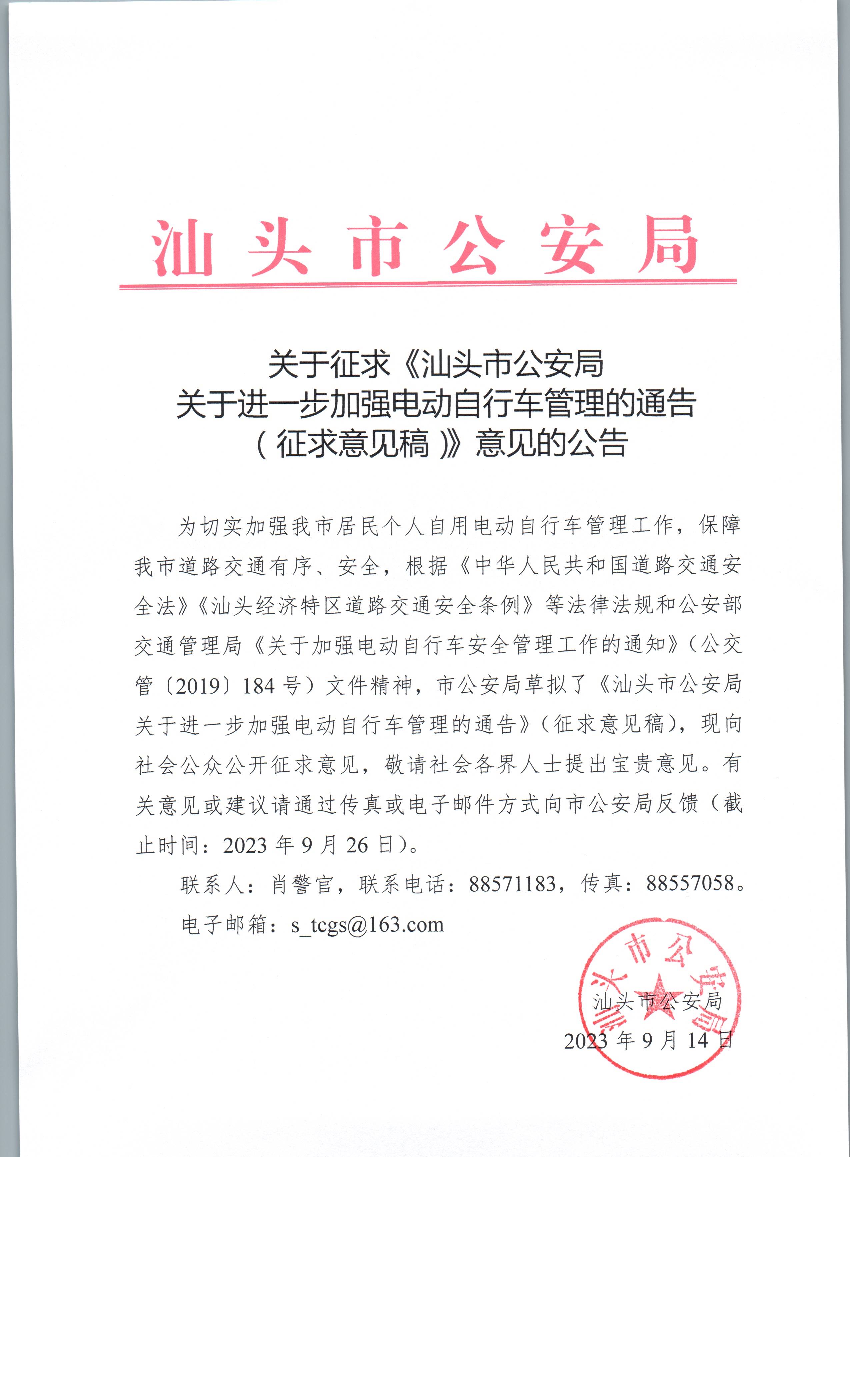 关于征求《汕头市公安局关于进一步加强电动自行车管理的通告(征求意见稿)》意见的公告 001.jpg