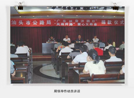 6月29日下午,局举行“汕头市公路局‘扶贫济困日’、‘风雨同路’爱心互助金捐款仪式”,拉开了我局“扶贫济困、奉献爱心”为主题的第三届“广东扶贫济困日”暨市公路局“风雨同路”互助金启动的帷幕。会上,局领导带头捐款,驻汕各单位、局机关各科室干部职工积极响应,慷慨解囊、踊跃捐款,场面热烈,以我们的实际行动体现和弘扬了公路人扶贫济困、共建和谐的慈善精神。
