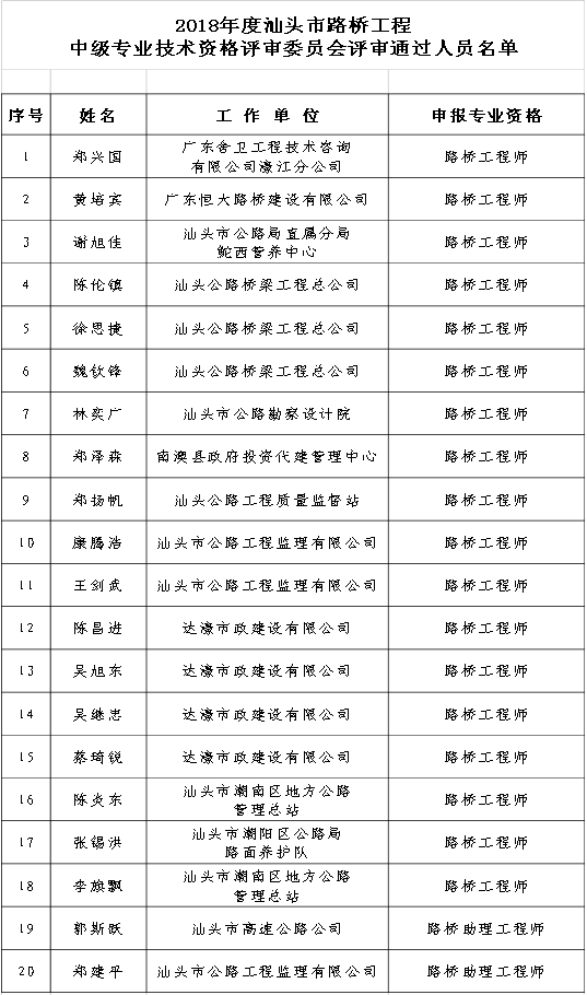 2018年度汕头市路桥工程中级专业技术资格评审委员会评审通过人员名单(附后)