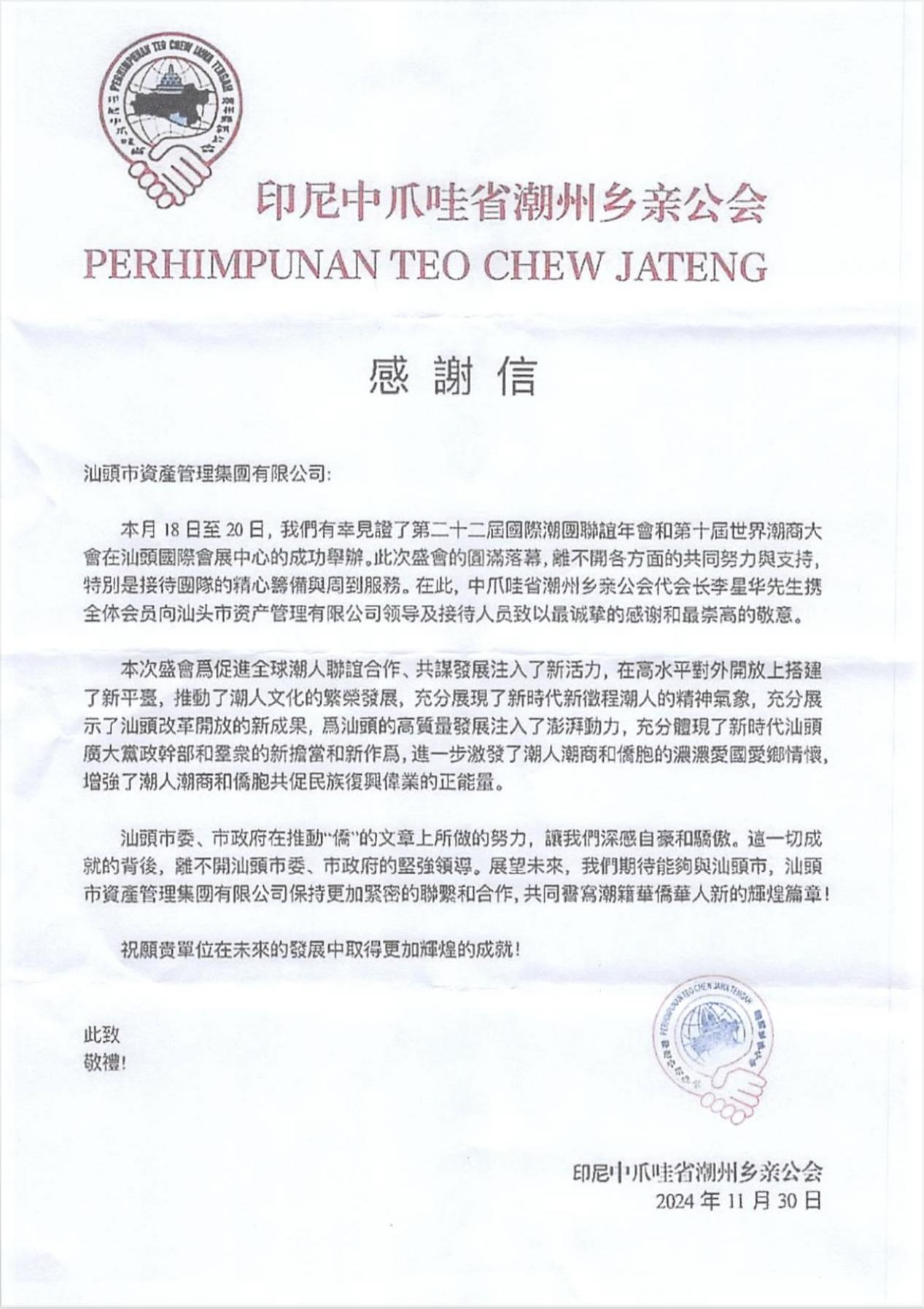 近日,印度尼西亚共和国中爪哇省潮州乡亲公会发来感谢信,盛赞市委市政府、资产集团“一对一”接待组的用心接待与周到服务。接下来,资产集团将在上级的正确领导下,与潮侨潮商携手并肩,共同谱写汕头经济社会高质量发展的新华章。
