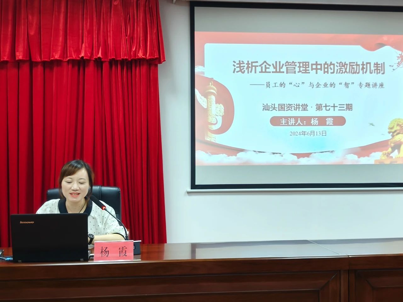 6月13日下午,第七十三期“汕头国资讲堂”在汕头市国资委机关举办。本次邀请汕头市国润食品有限公司人事部经理、工会副主席杨霞同志作题为《浅析企业管理中的激励机制——员工的“心”与企业的“智”》专题讲座。市国资委机关,市属国有企业干部职工参加讲座。
