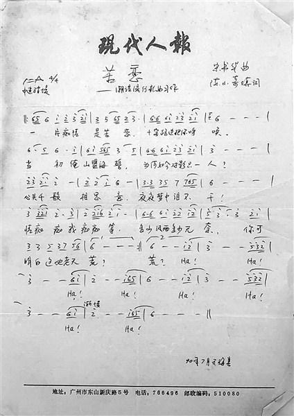 陈小奇创作的潮语歌曲《苦恋》手稿