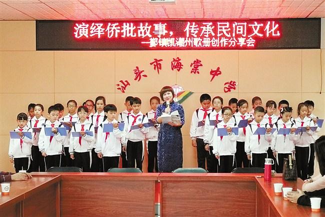 活动中,海棠中学歌册班同学演唱歌册《狼牙山五壮士》。随后,月季小学的同学们跟随潮州歌册传唱指导老师麦微纯演唱歌册《风雨侨批情》。麦微纯欣慰地说,歌册与侨批文化融合,让歌册唱得更生动,让年轻一代更喜爱。同时,孩子们通过诵唱《血泪侨批情》等侨批故事,对潮商艰苦奋斗和诚信经营的精神有了深刻印象。