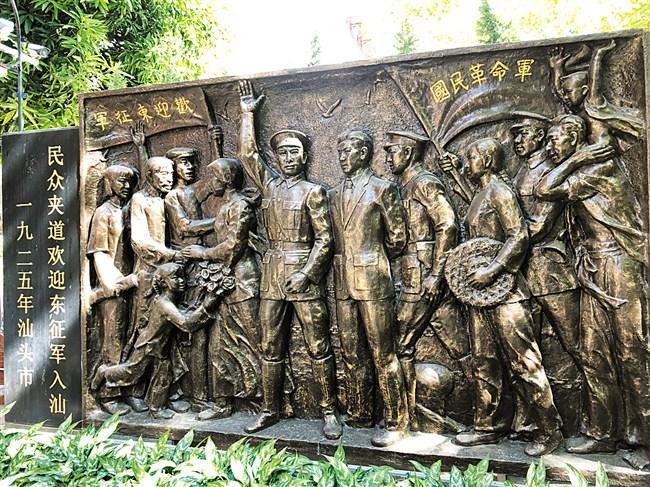 由于正在进行修缮,这里并未对外开放。告知来访目的,工作人员带领记者走进大门,映入眼帘的是两栋欧式“小红楼”,一为东楼,一为西楼,坐北朝南,并排而立。据介绍,旧址原是英国人办的酒店,名曰“适宜楼”,后改为“戈宝抽纱行”,至今已有近百年历史,旧址东、西两楼仍保持当年风貌。在院子的尽头,东楼一侧,有一幅纪念东征历史的青铜浮雕,上面刻着“一九二五年汕头市民众夹道欢迎东征军入汕”。