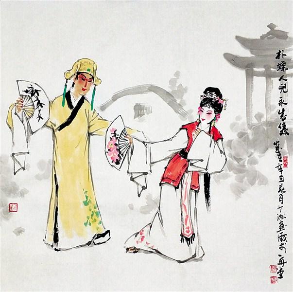 《扑蝶人儿永成双》的戏画中,郭家后花园的亭台楼阁,寥寥数笔,若隐若现,豪华气派;娉婷少女,手持绢扇轻掩羞涩;黄衣少年,一袭飘逸,意气风发倜傥风流。