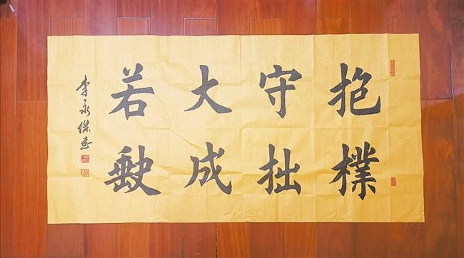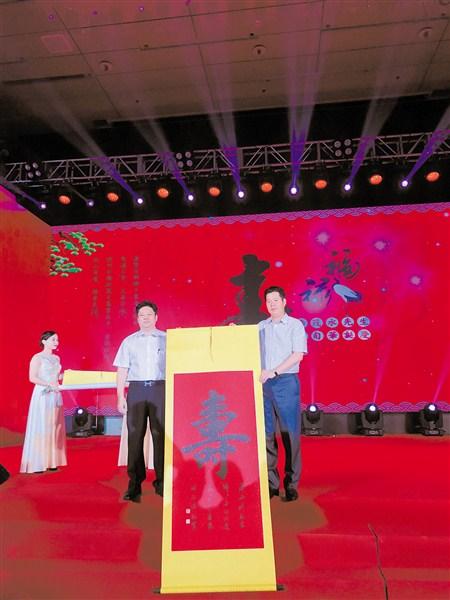 为深圳市海岸集团赠送“寿”字,图右为海岸集团李奕标董事长。