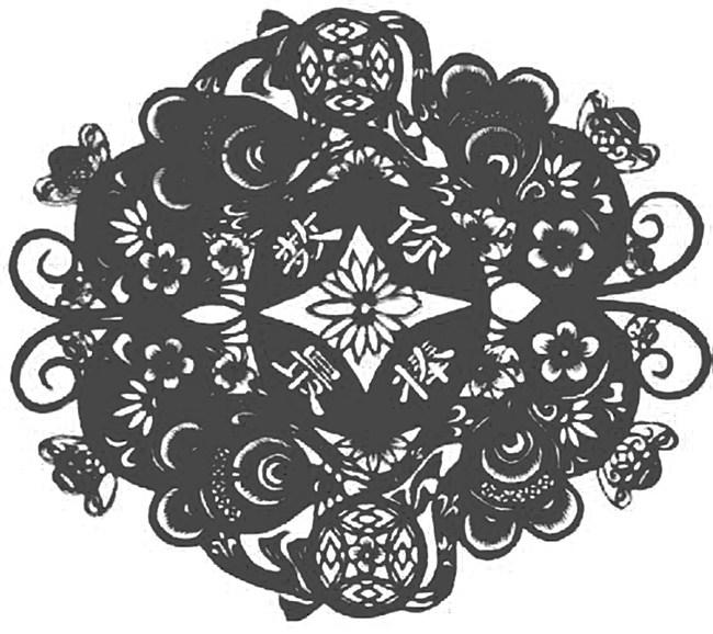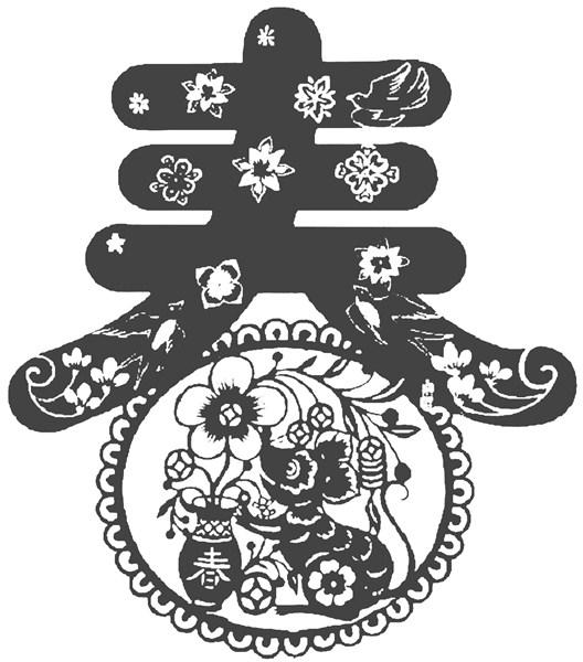 蔡苑华的作品《金子献春》整体为“春”字形,上半部主要是阴剪,其中点缀着各式花朵,还有3只春燕,点明春天到来了。下半部主要是阳剪,图形为老鼠献花瓶,瓶中果实处理为金钱状,因鼠在十二地支中属子,故有“金子献春”之说。