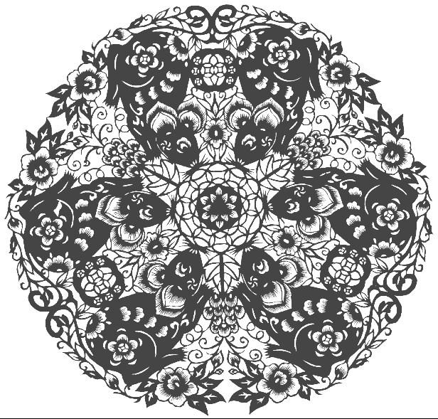 先看姚棉坚的《金鼠同顺》,作品为团花状,主体画面由6只老鼠构成,周边为祥花琪草,把画面搭配得疏密有致。老鼠身上阴剪阳剪穿插使用,其中的梅花心乃金钱图形,不但增添春意,寓意财源广进,而且把潮阳剪纸“花中套花”的技艺运用得淋漓尽致。