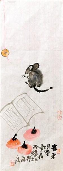 鼠年画鼠,我想南舟并非赶时髦,而应是老鼠触发他的灵感,想借老鼠表达某种思想。在人们印象中,老鼠形象很多是负面的,带鼠字的成语,如“鼠目寸光”、“鼠窃狗盗”等等,往往是带贬义的。然而,慢慢品味此画,我却感到图中老鼠有一种浪子回头的味道。试想,前面有利益,下面有食物,而贪婪的它不去关顾,而是关注着书本,让人有一种知识改变性格的感觉。此时的老鼠,似乎已经领悟到“莫伸手,伸手必被捉”!