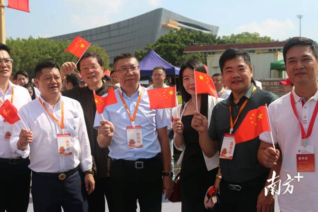 回家乡参加花车巡游活动的侨胞合影。