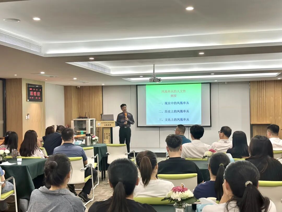 韦中铭老师出生于广东潮州凤凰茶农世家,90年代获得北大法学硕士学位。他作为高级法官,在国徽下断过案;作为汕大法学院客座教授,在高校里教过书;作为凤凰单丛著名大师、非遗传承人的弟子,长期致力于凤凰单丛茶文化的研究,出版过学术专著《中国凤凰单丛》。 韦中铭老师从分类、品种和品系、香型等多维度科普了凤凰单丛的特征;引经据典讲述了凤凰单丛背后的历史渊源和文化故事。凤凰单丛从名丛的选拔、制作工艺到品鉴方式都承载着丰富的文化内涵,彰显了忠孝节义、知行合一等人文精神。一缕茶香忆往昔,凤凰单丛也是海外华侨华人维系乡情的纽带,一片小小的茶叶漂洋过海,为在海外打拼的异乡客带去家乡的味道和祝福。 华侨试验区文化夜谈已连续举办17场,致力于弘扬传承传统文化,唤醒更多青年博硕士人才的文化记忆。